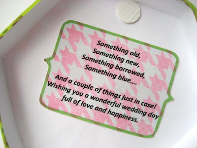 Some of the goodies I have inside the box. I shopped the travel aisle for some things, an emergency kit for others and also added an emergency "something blue" for luck :) Again, scraps pf the houndstooth are great for repackaging loose items.